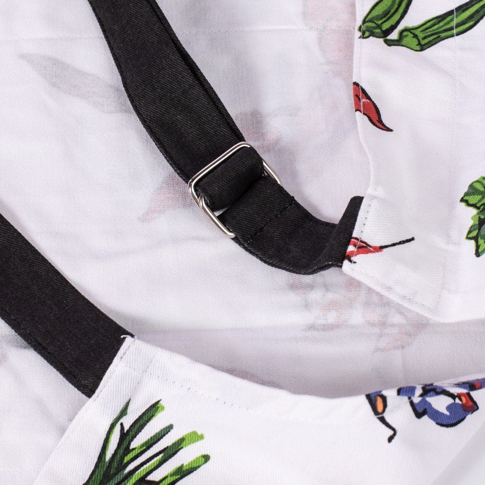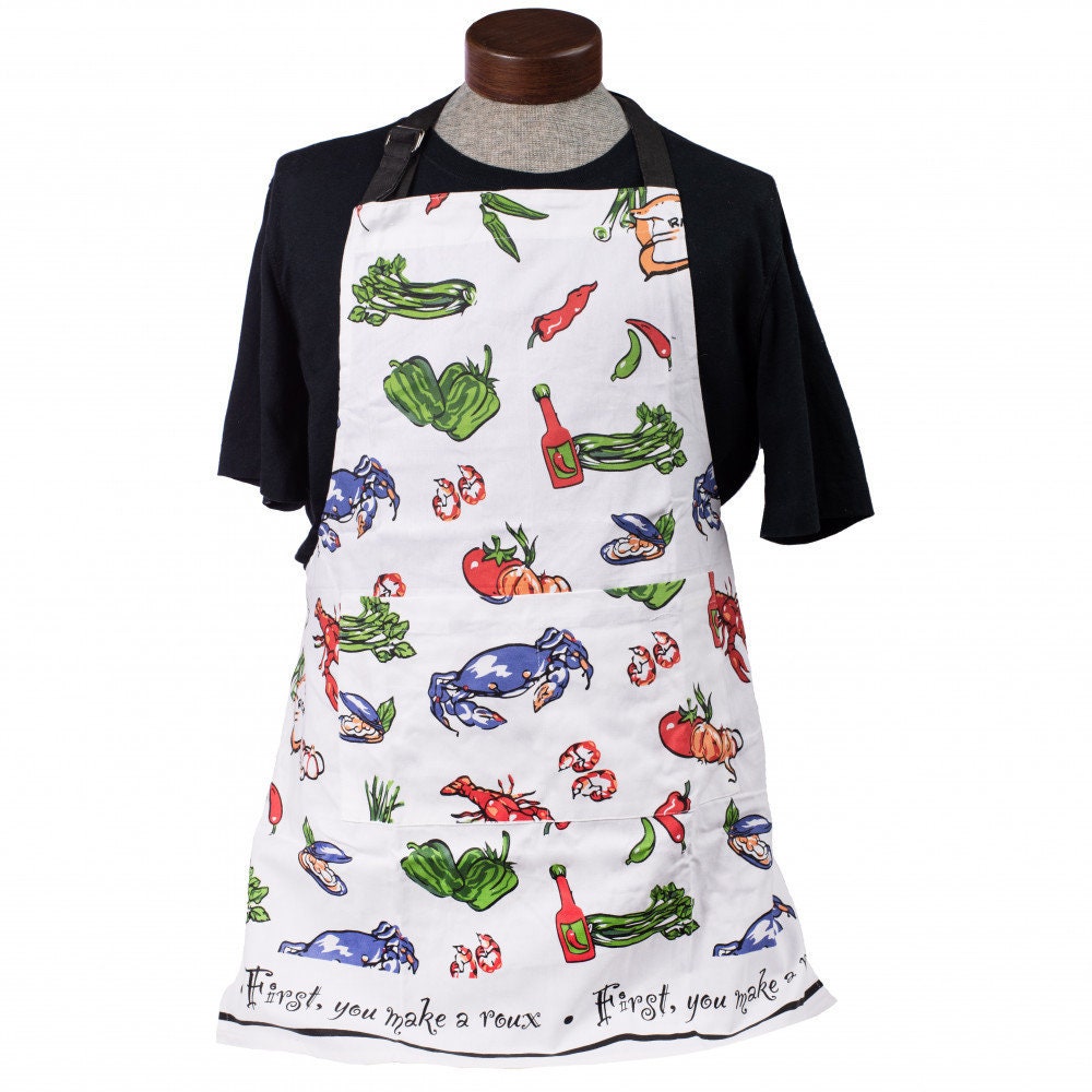 This apron celebrates one of Louisiana's classic dishes, seafood gumbo. Hand sketched depictions of the dish's ingredients create a colorful pattern across the front. "First You Make a Roux" is written across the bottom hem.
